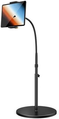 Looking for something rigid? You’ve come to the right place. T-SIGN tripod tablet stand sacrifices a bendable gooseneck for a fixed clamp on a rotating ball joint. The pole has 4 segments, with an adjustable height.