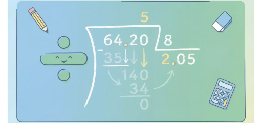 Example: 6.75 ÷ 5. Divide: 5 goes into 6 once (remainder 1); bring down 7 → 17; 5 goes into 17 three times (remainder 2); bring down 5 → 25; 5 goes into 25 five times. Quotient: 1.35.