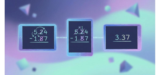 Example: 5.75 − 2.38. Align: 5.75 − 2.38. Subtract: 5−8 requires regrouping: 15−8=7; 6−3=3; 5−2=3. Difference: 3.37.