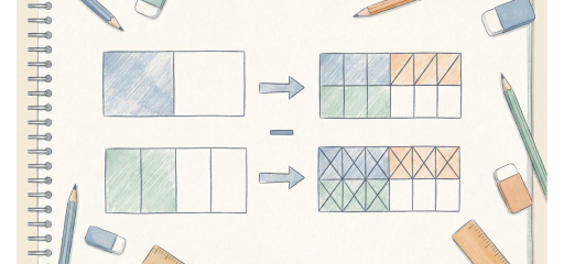 Example: \(\frac{3}{4} – \frac{1}{3}\). LCM(4,3)=12. \(\frac{3}{4}=\frac{9}{12}\), \(\frac{1}{3}=\frac{4}{12}\). \(\frac{9}{12}-\frac{4}{12}=\frac{5}{12}\).